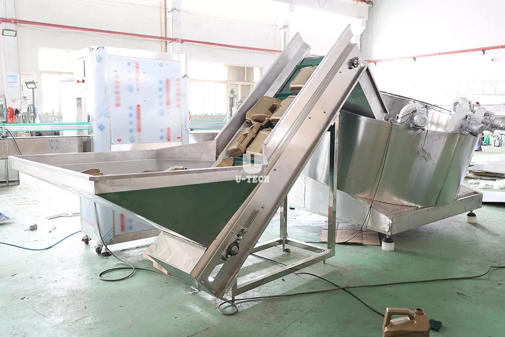 The bottle unscrambler is to disperse plastic bottles in a messy condition and arrange the bottles neatly and stand on the conveyor belt regularly to meet the requirements of high automation. The function of the unscrambler is to sort out the disorderly stacked beverage bottles and arrange them on the conveyor belt in an orderly and directional manner, and transfer them to other machinery at high speed and efficiency for the next process to improve the production efficiency of the entire production line.