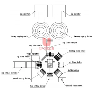 Full automatic spring cap desiccant silica gel wadding inserting filling sealing assembly machine